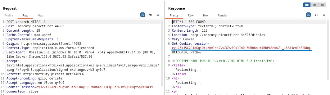 We could try to modify the value of the session cookie from the first POST request (which is the one that grants the redirect) to contain “admin”, then send the GET request to /display with the new modified value for the cookie