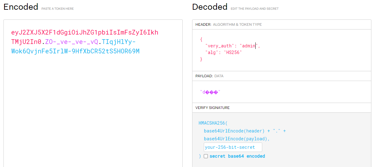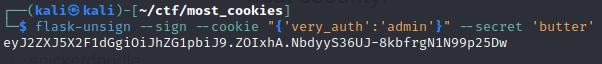 Now we can forge a new cookie with “very_auth” = “admin” and our newly found secret key