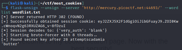 this command fetches the cookie in the session of the website specified and brute forces the secret key with a list of possible keys contained in “wordlist.txt” (a file I created with the values of cookie_names)